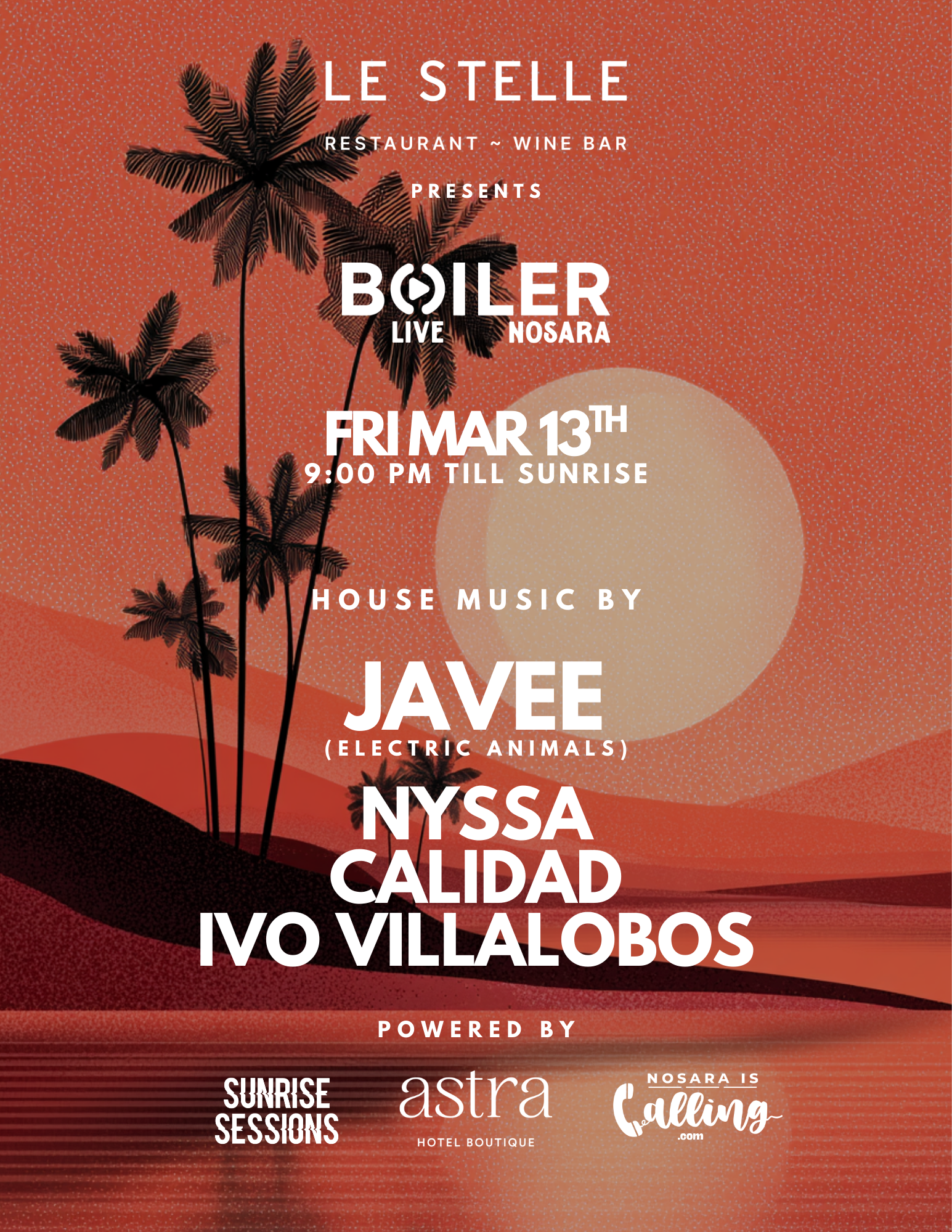 Experience an unforgettable night at Le Stelle Restaurant & Wine Bar as they present Boiler Live Nosara—an experience that takes you from 9:00 PM straight through till sunrise.